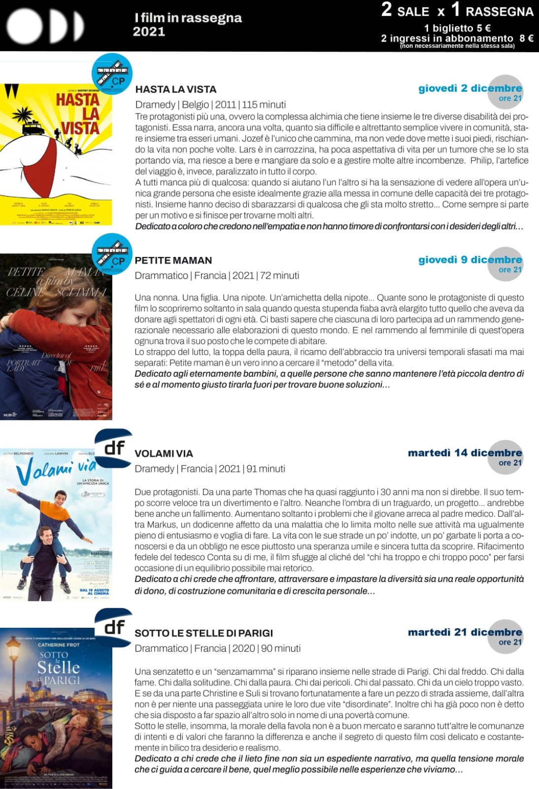 Un segno di luce è già il fatto che la facciamo in collaborazione con il cinema Pedagna, un’altra sala ACEC a Imola: 2 sale, 1 rassegna. Se si fa un abbonamento per due film, il secondo può essere usufruito anche nell’altra sala.